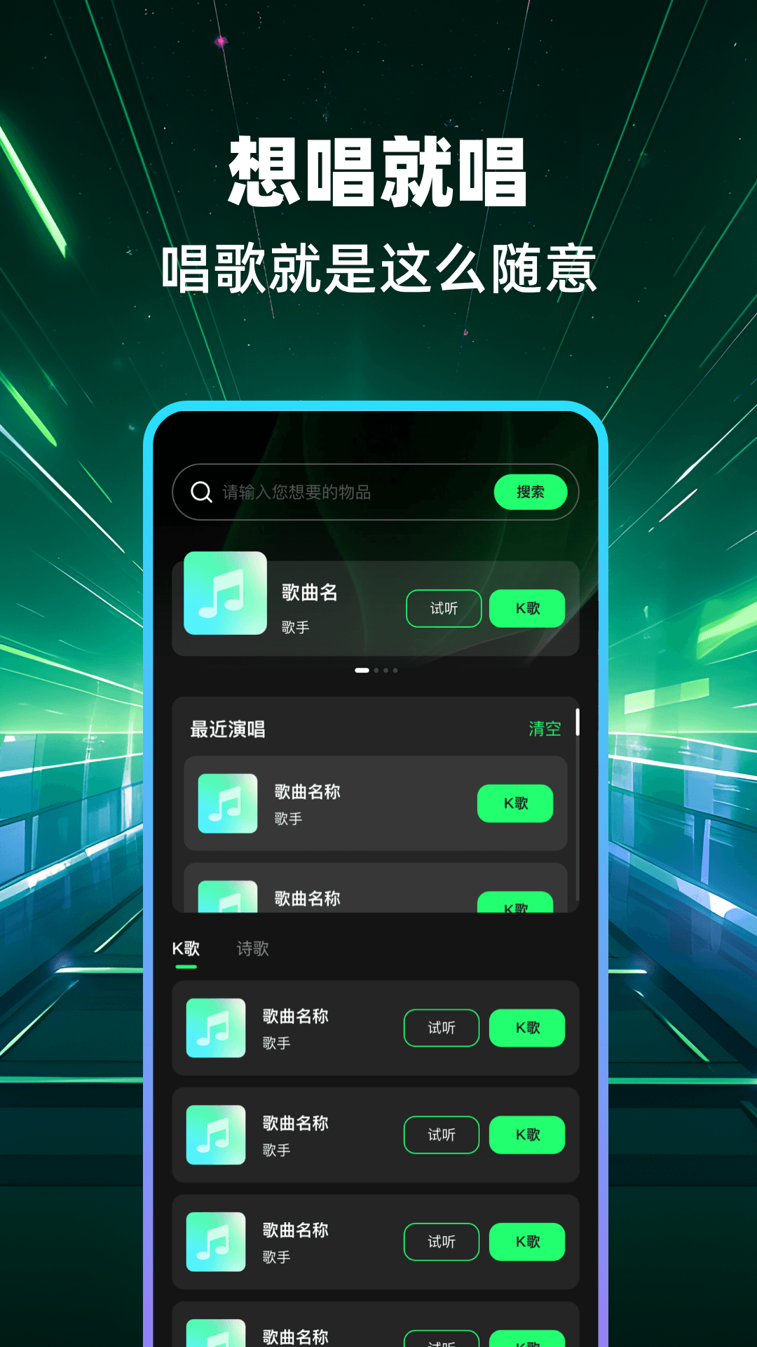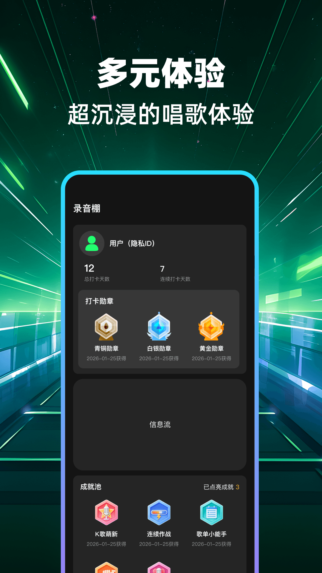 这是你的随身移动练歌房,承包所有欢唱时刻!支持热门歌曲搜索、在线试听与一键 K 歌,专业录音棚功能可精准录制音乐、语音笔记等内容。独特打卡体系搭配青铜、白银等进阶勋章,记录你的每一次开嗓,轻松解锁 K 歌达人成就,让你随时随地用歌声表达自我!