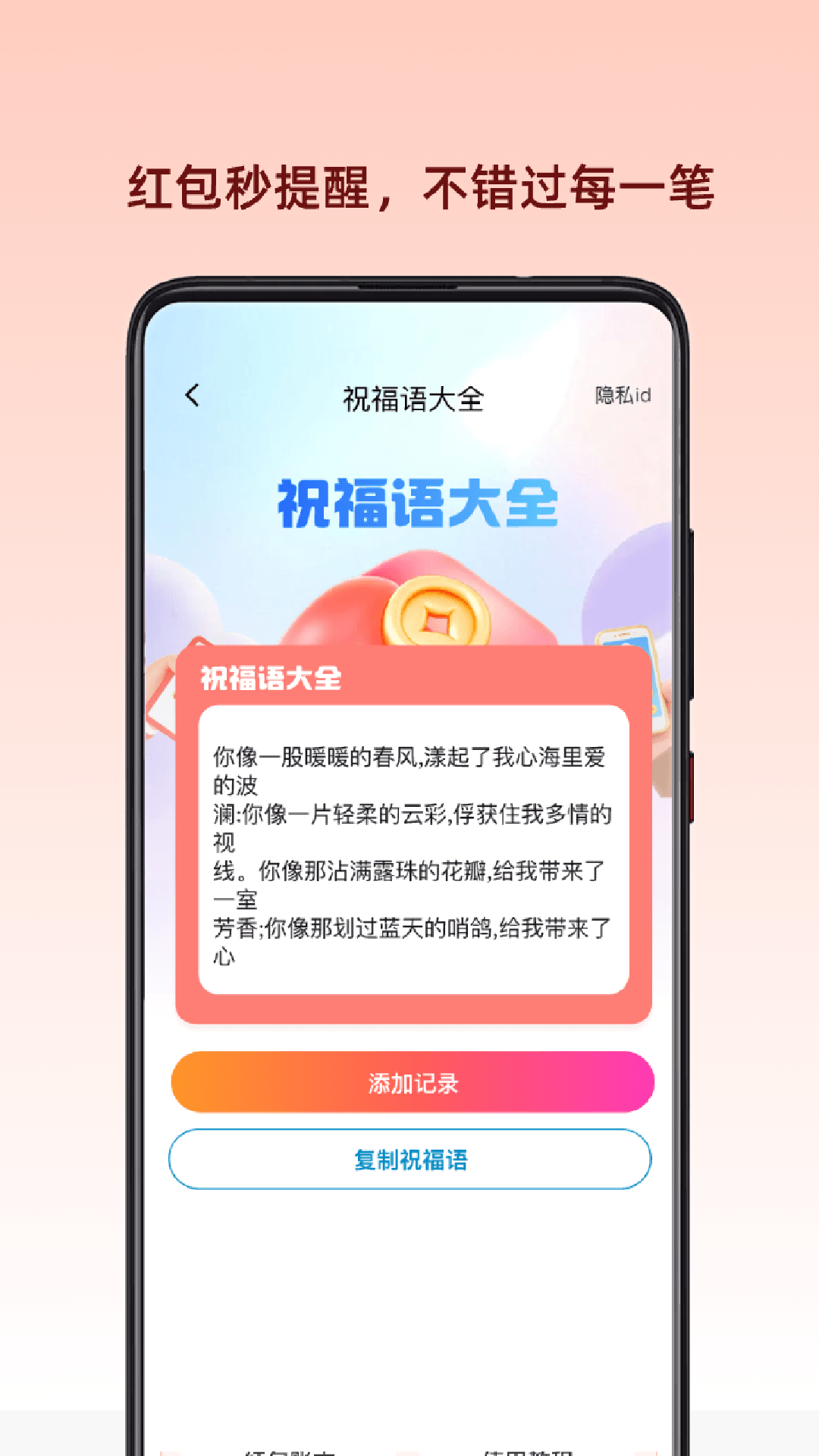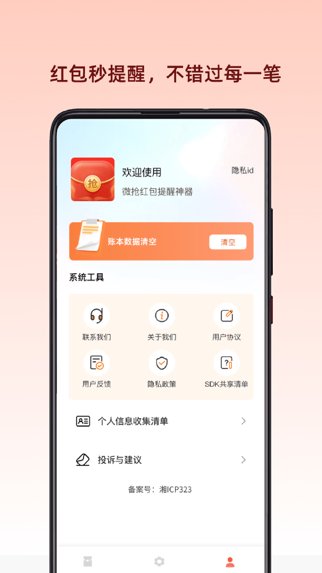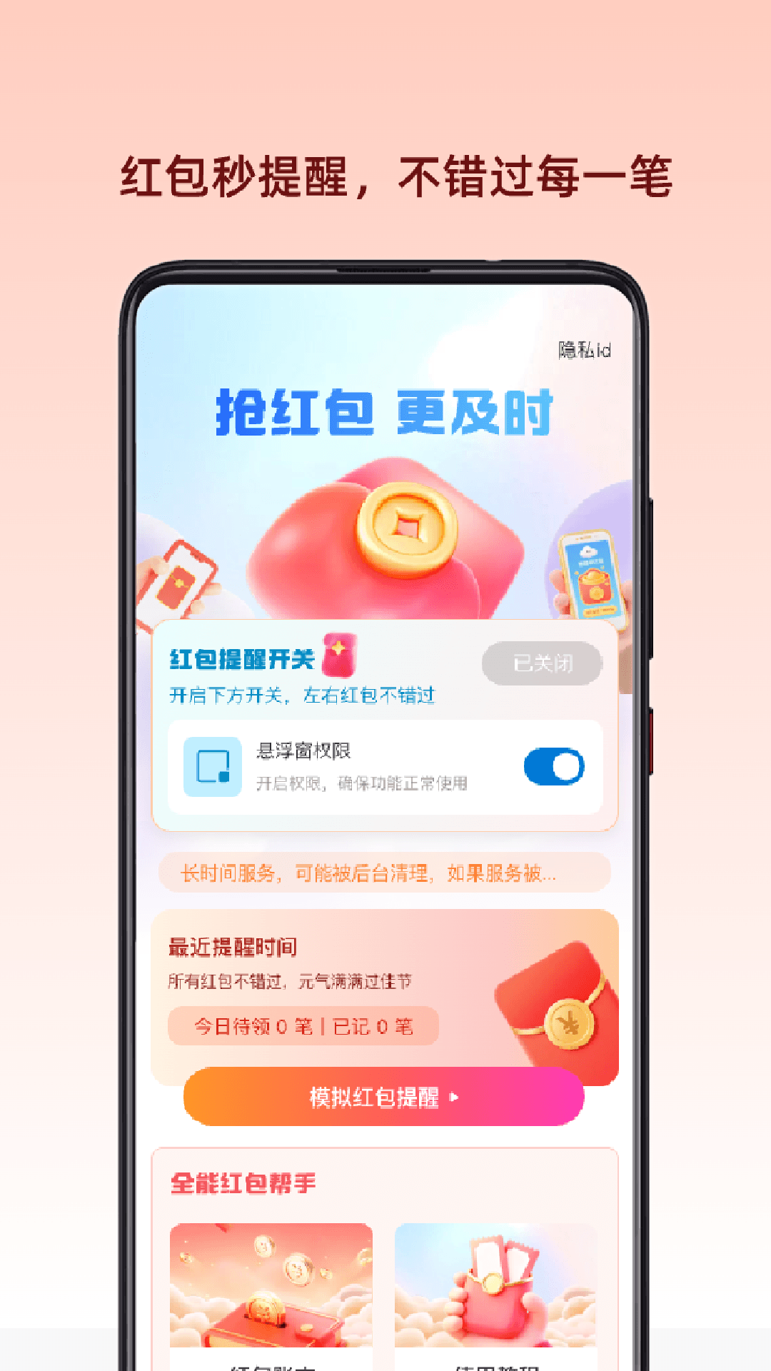 这款抢红包助手专为红包场景打造,核心功能支持微信平台红包实时提醒,仅触发铃声 / 震动提示不自动抢,安全合规。搭配 10 项实用本地功能:红包账本可统计收支、笔数,金额计算器一键算均分 / 凑整金额,海量祝福语一键复制;还能自定义提醒音效、设置红包高峰时段提醒与免打扰时段。桌面悬浮窗可快捷启停提醒。App 分 3 大板块:首页一键掌控提醒状态 + 高频工具,工具库分类收纳全功能,我的页面可管理权限与数据,操作简单又实用